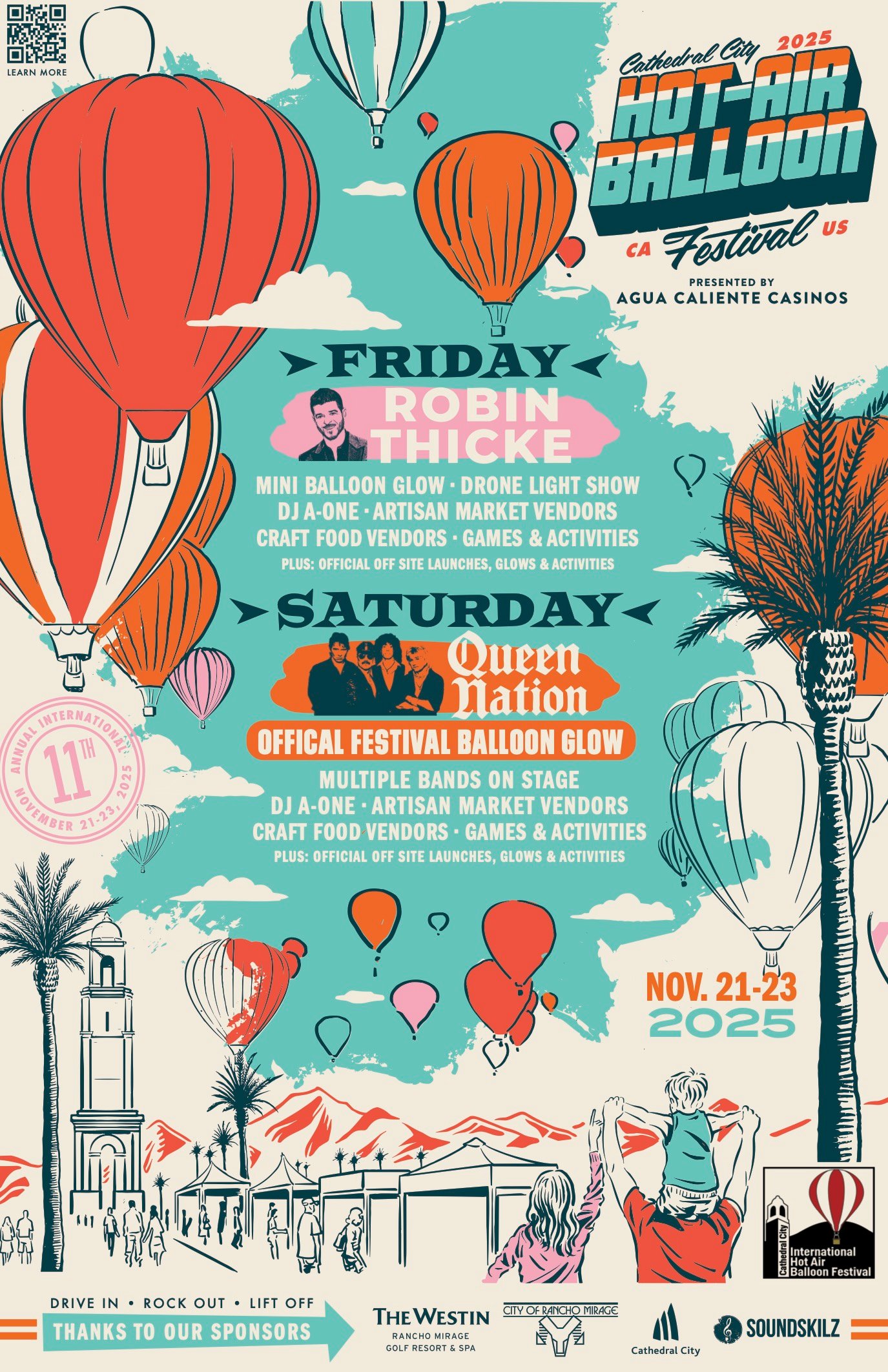 The festival runs Friday through Sunday, November 21–23, 2025, with morning balloon launches, evening glows, and activities throughout the day. Parking and shuttle details will be available closer to the event on the official Cathedral City Hot Air Balloon Festival website: https://www.cathedralcityhbf.com