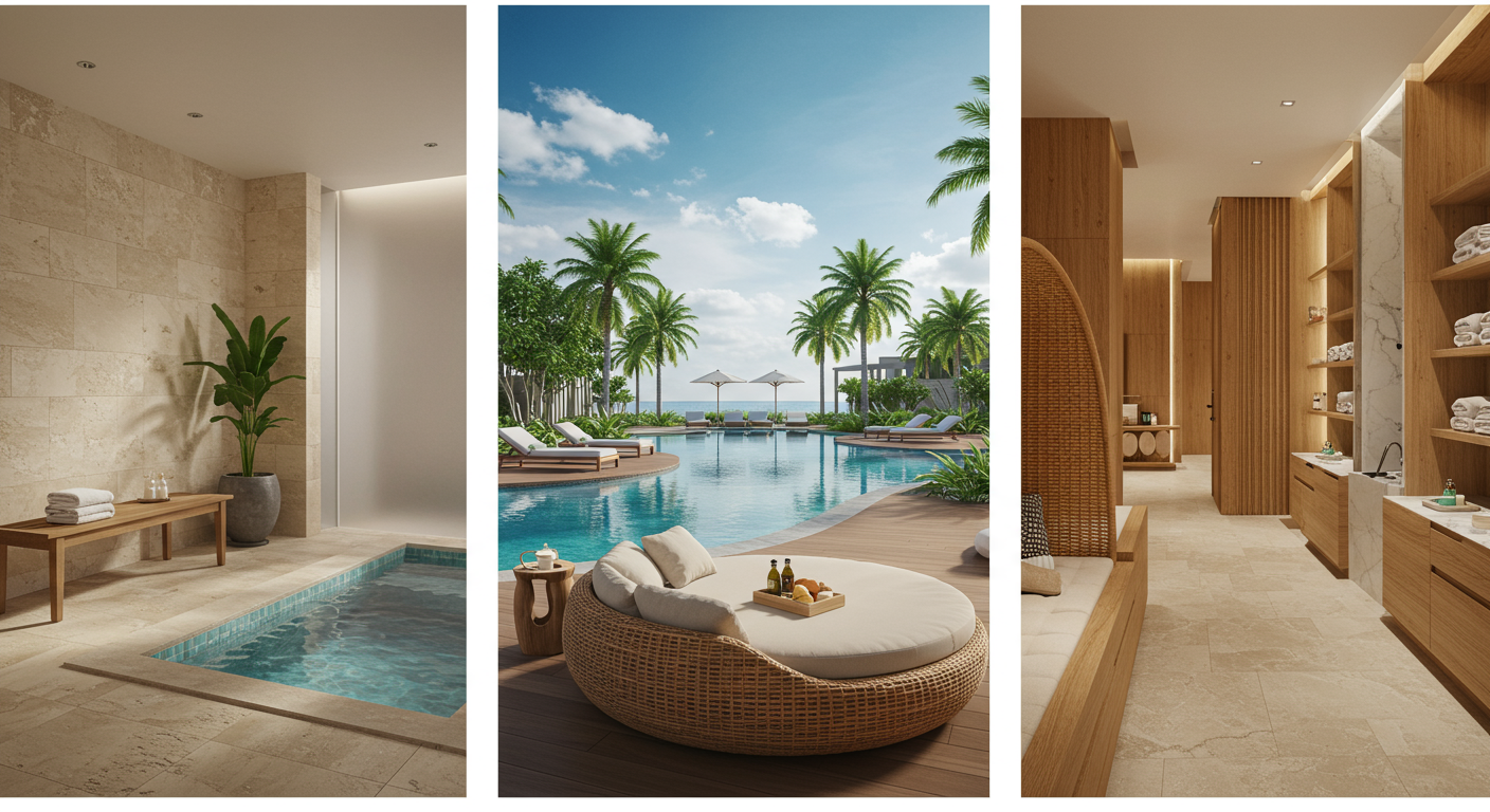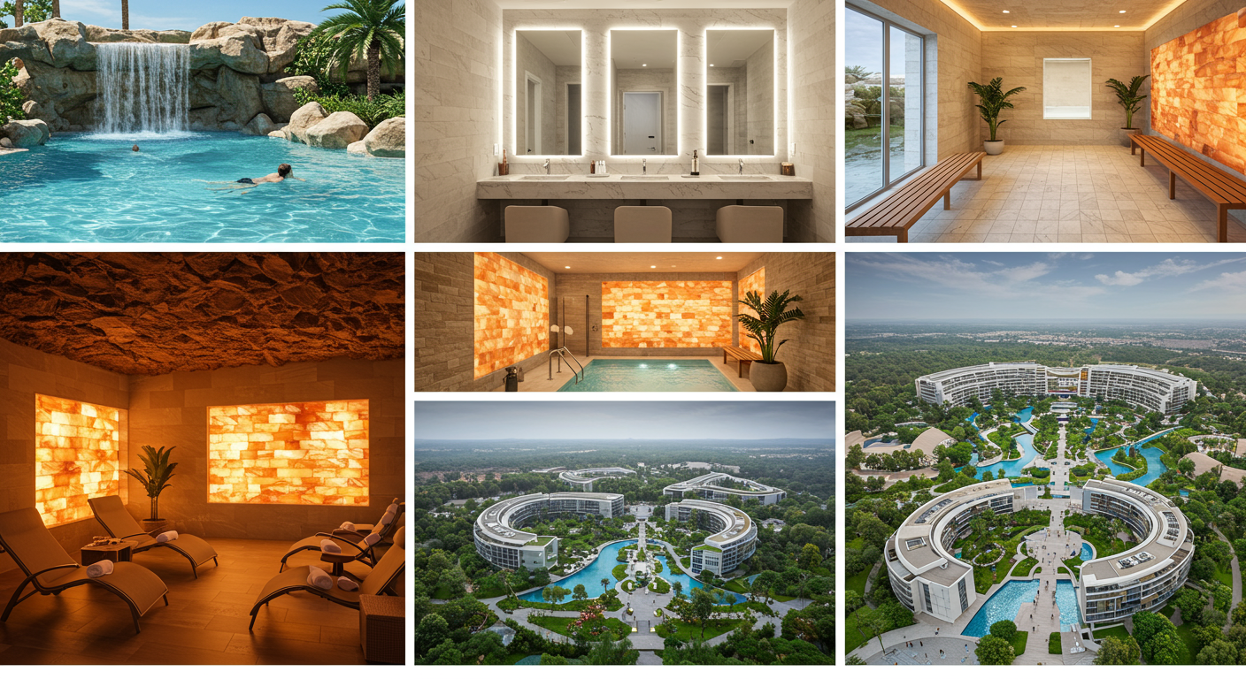 The Spa at Séc-he offers 22 private mineral baths, 15 treatment rooms, a cryotherapy chamber, two float pod suites, a boutique fitness area, a grounding room, an acoustic wellness lounge, a tranquility garden, a menthol dry sauna, a eucalyptus steam room, two halotherapy salt caves, a resort-style pool with a waterfall and grotto, a zero edge mineral pool, four whirlpools, luxury cabanas, full-service salon with scalp treatment beds, a cafe and a poolside bar with food service.