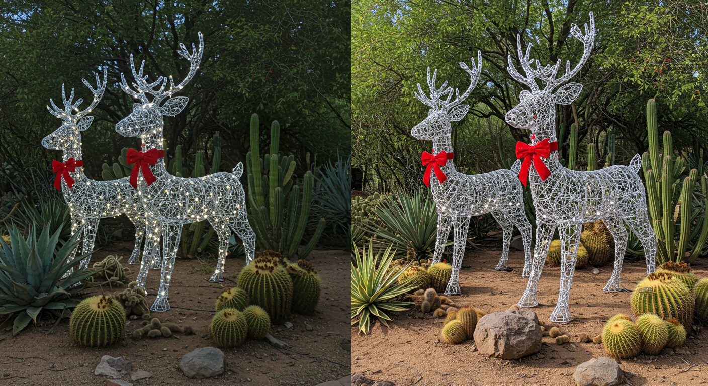 While we don’t get deer here in the desert, adding a trio of light-up deer gives us a little holiday cheer. We love our flat LED deer set up in our backyard so that we can enjoy them on cool evenings. We recommend nestling them up near a few cacti or ficus like they are nibbling on our desert foliage.