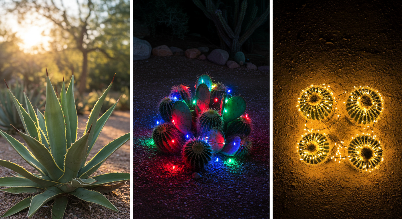 While you might think we also recommend draping lights on your cacti we recommend ornaments. You could put lights on… but getting those strings off without being poked may not be successful. So think agaves covered in ornaments or barrel cacti tailed in Christmas lights.