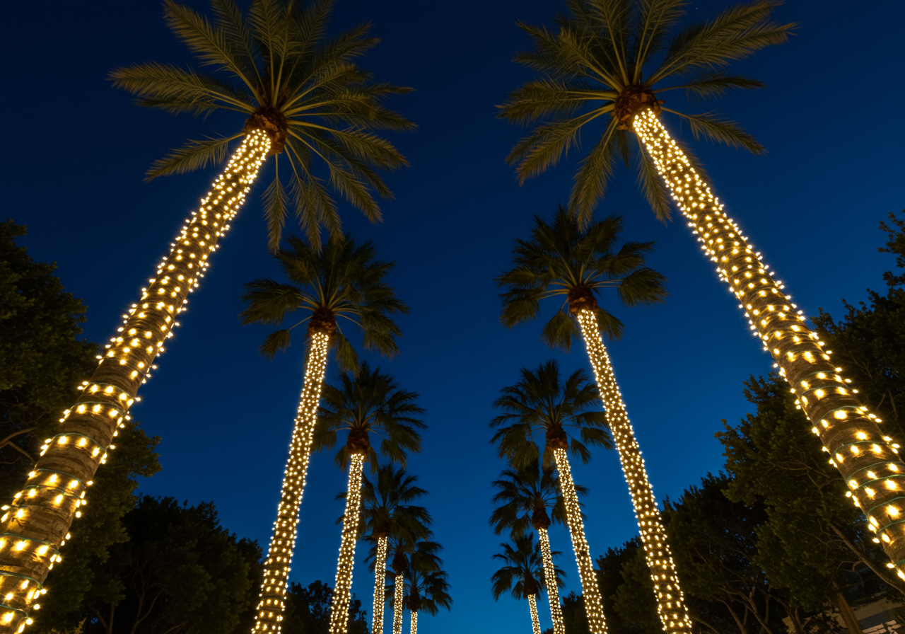 Wrap your palm trees! You’ll notice this is super common and a trend to do all over the valley. No evergreens – just palm trees lit up in rows.