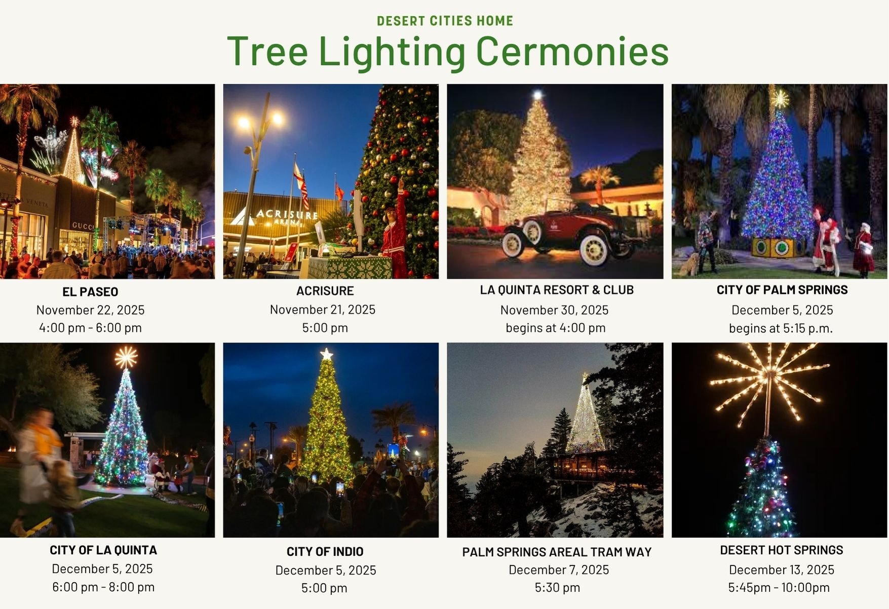 To help you plan a magical holiday season, we’ve curated a complete 2025 guide to the best tree lighting ceremonies and festive events happening throughout Palm Springs, Palm Desert, La Quinta, Indio, and Desert Hot Springs.