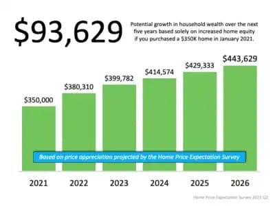 Home prices are climbing today, and the data in the survey indicates they’ll continue to increase, but at rates that approach a more normal pace. Even still, the amount of household wealth a homeowner stands to earn going forward is substantial. This truly becomes clear when we consider a scenario using a median-priced home purchased in January of 2021 and the projected rate of appreciation on that home over the next five years. As the graph below illustrates, a homeowner could increase their net worth by a significant amount – over 93,000 dollars by 2026.