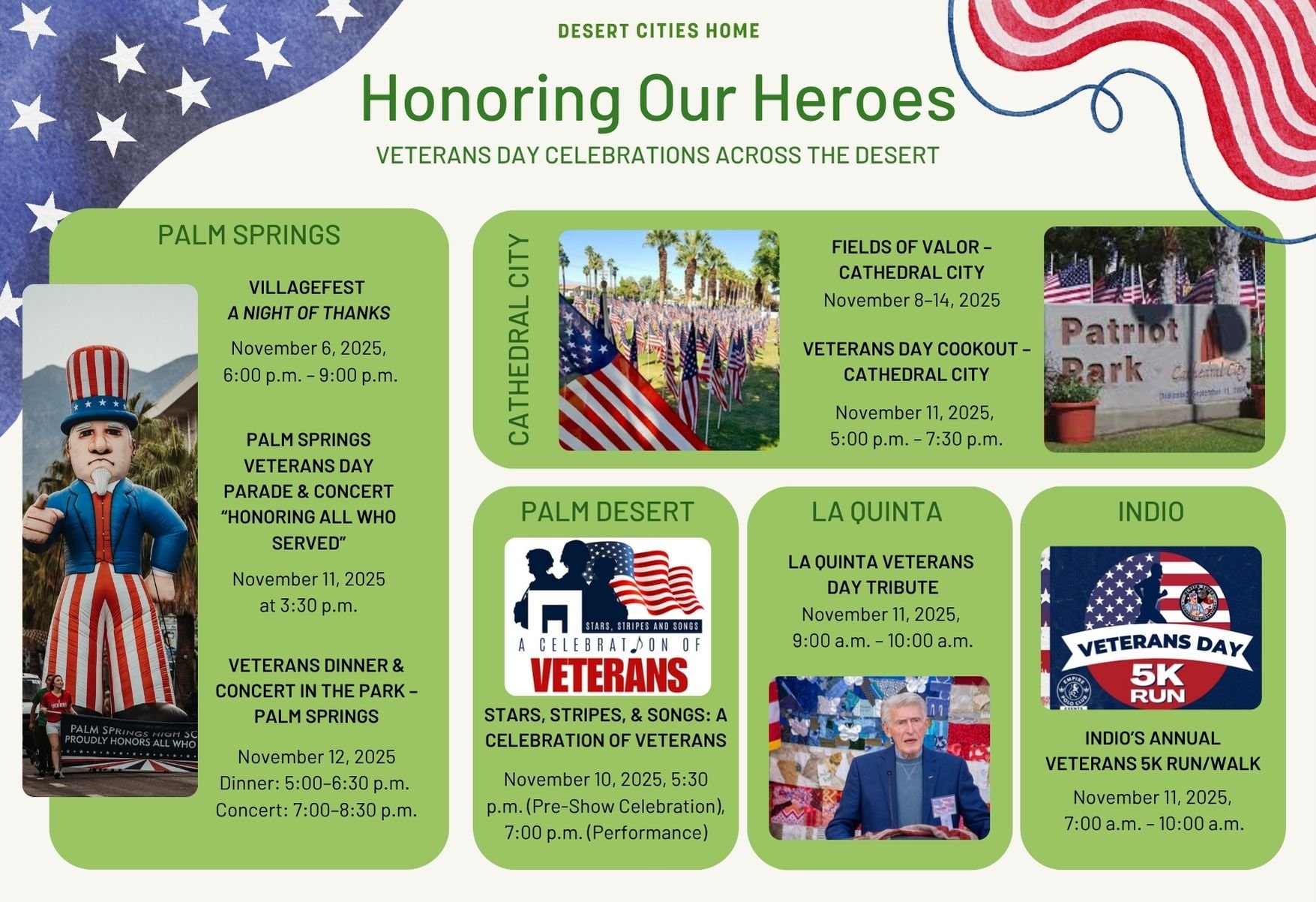 Every November, communities across the Coachella Valley come together to honor the brave men and women who have served in the United States Armed Forces. From heartfelt tributes and concerts to parades and family events, Veterans Day offers a time for reflection, gratitude, and unity. Whether you’re a local resident or visiting the desert this fall, here are the Veterans Day 2025 events happening across Greater Palm Springs and neighboring cities.