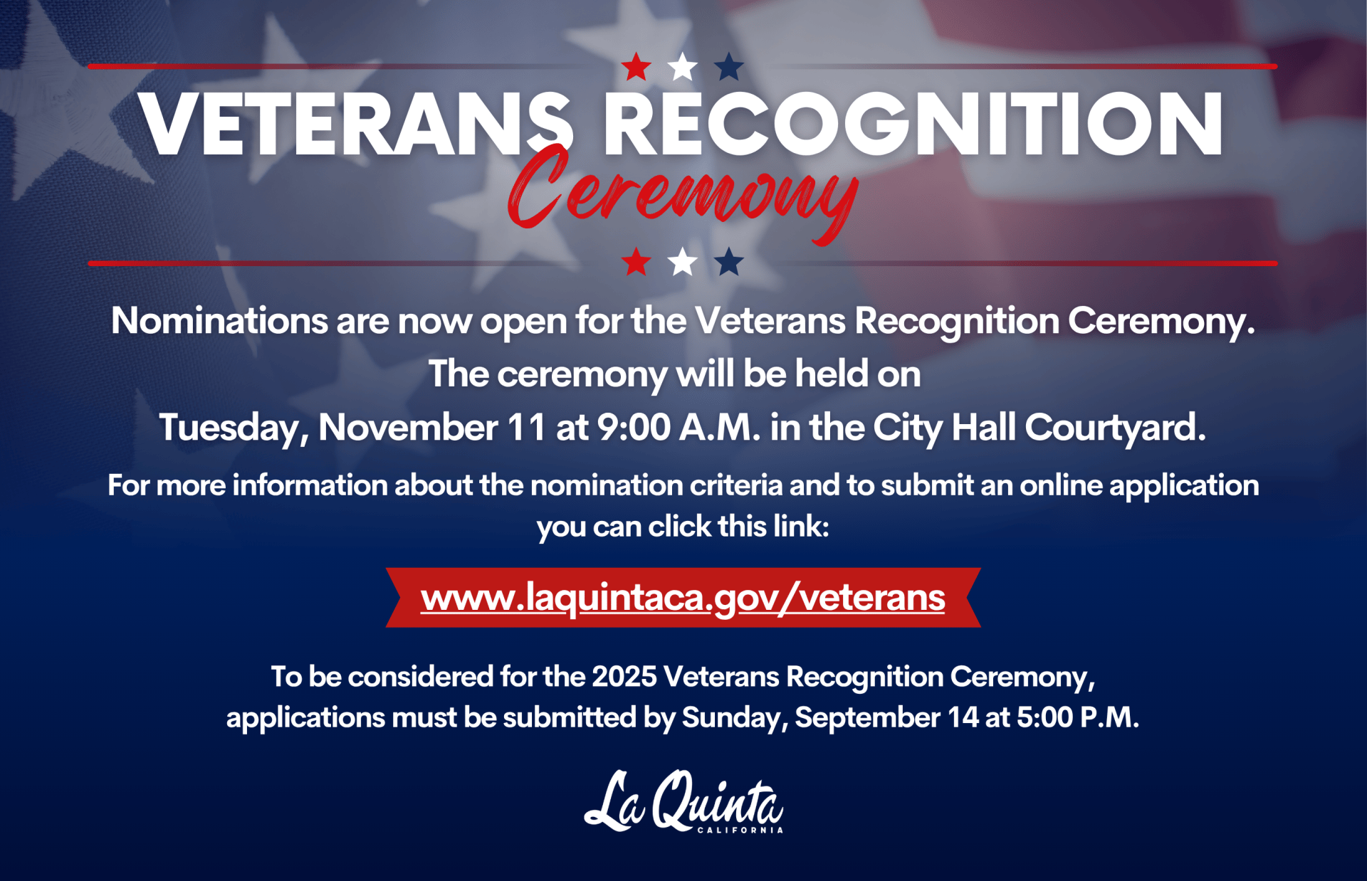 The City of La Quinta hosts an intimate morning ceremony honoring veterans and their families. Set against the peaceful backdrop of City Hall’s courtyard, this tribute includes guest speakers, musical performances, and a heartfelt moment of reflection for those who have served and sacrificed for our nation.