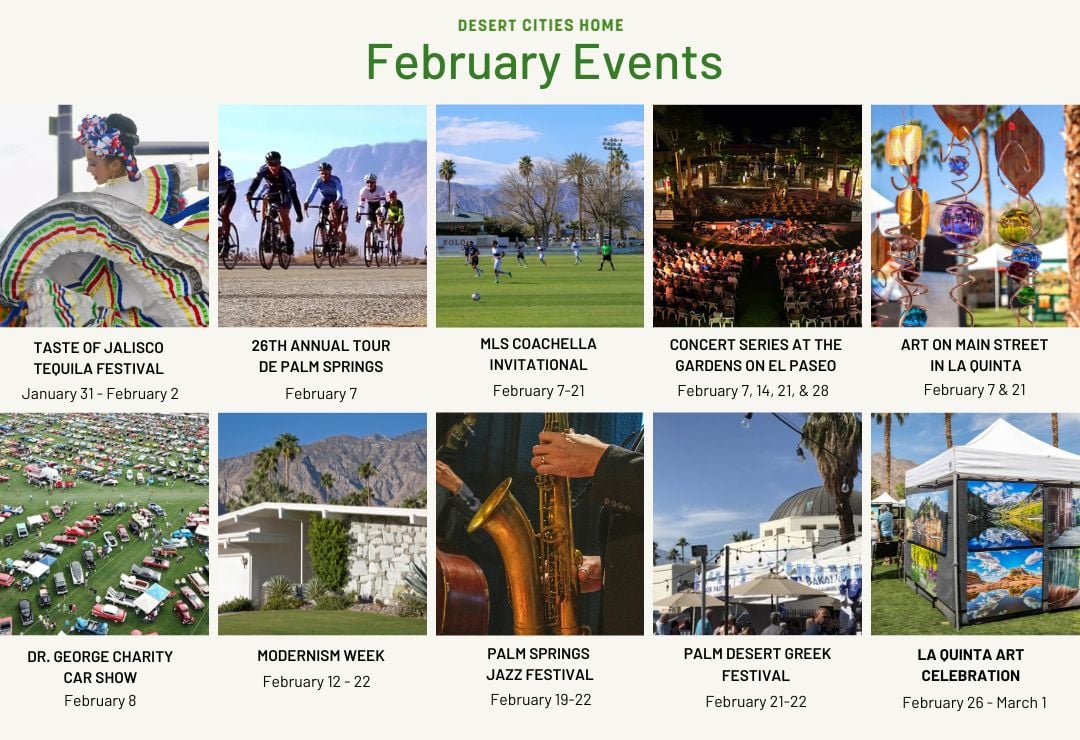 February is when the desert truly comes alive. Cooler temperatures, longer days, and peak seasonal energy bring an incredible lineup of festivals, concerts, sporting events, and cultural celebrations across the Coachella Valley. Whether you’re a full-time resident or enjoying the desert as a winter escape, these events reflect the lifestyle, community spirit, and vibrancy that make this region so desirable.