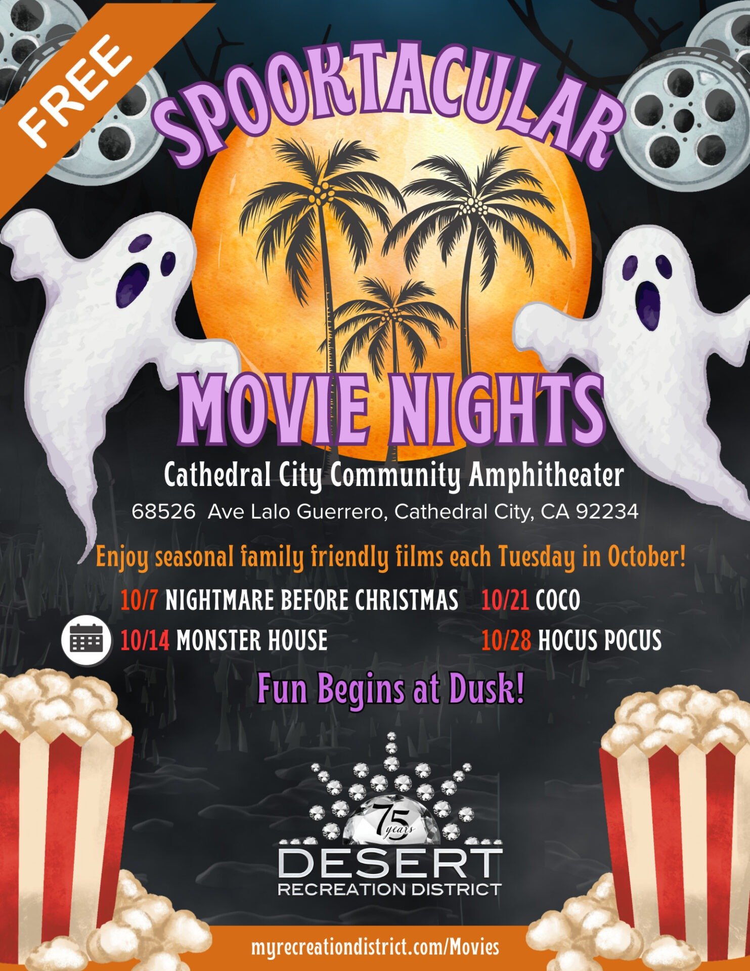 Come join in the fun at Spooktacular Movie Nights at the Cathedral City Community Amphitheater. The fun starts at dusk each Tuesday night during October with seasonal family friendly films.