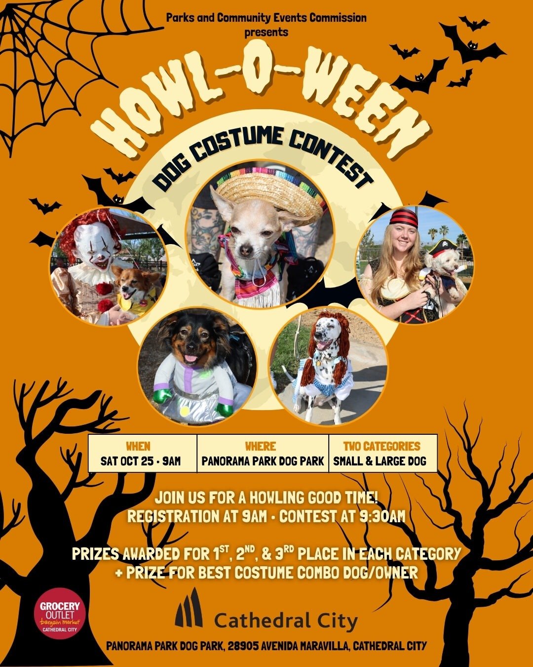 The Cathedral City Parks & Community Events Commission presents the Howl-O-Ween 2025 Dog Costume Contest at Panorama Park Dog Park. Join in on the fun at the annual Howl-O-Ween dog costume contest! Registration begins at 9 a.m. and the contest begins at 9:30 a.m. There will be prizes awarded for 1st, 2nd, and 3rd place in each of two categories – small and large breed. Plus there will be a prize for the best dog and owner combo costume!