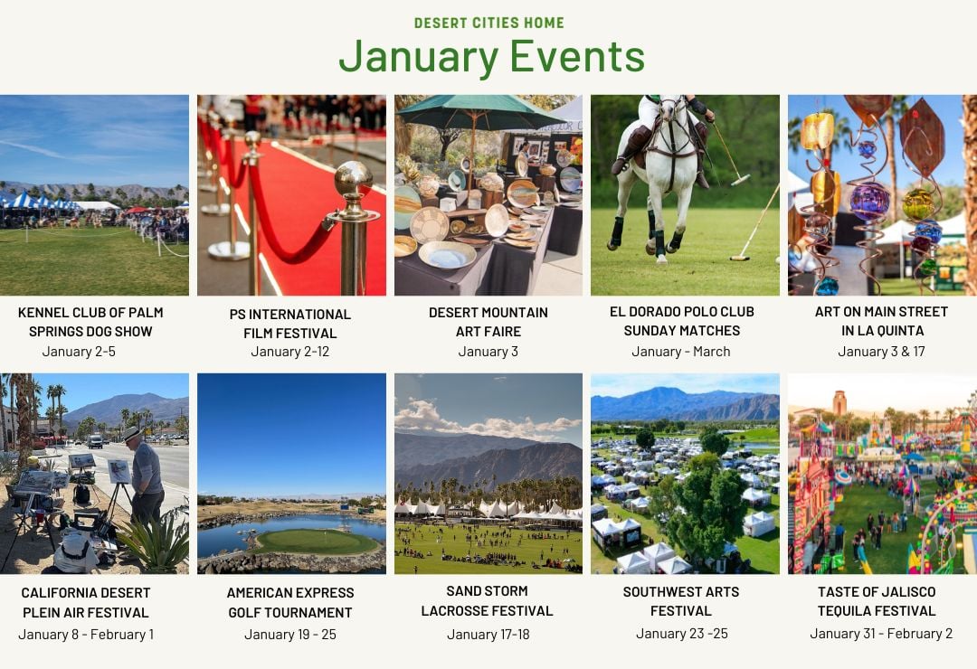 With its unique blend of culture, art, sports, and entertainment, the desert truly comes alive in January. As local agents who live, work, and thrive in the Coachella Valley, we’re passionate about sharing the experiences that make our community so special. From the excitement of the Kennel Club Dog Show to the culinary delights of the Taste of Jalisco Festival, these events reflect the vibrant lifestyle that draws so many to the area. Mark your calendars and dive into the desert’s best experiences—and if you’re ready to call this incredible place home, we’re here to help make that dream a reality!